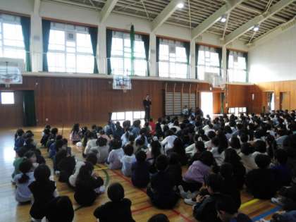 学校長の話を聞き、各クラスの発表から気づいたこと、大事なことを、全校みんなで確かめました。