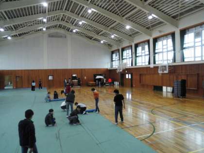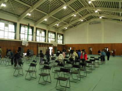 体育館のフロアに置いている跳び箱やマットを用具倉庫に片付け、床のぞうきんがけをした後、シートを敷きました。そして、いすを並べました。