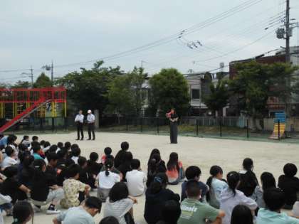 運動場に避難した後、担当の教職員と学校長の話を聞きました。