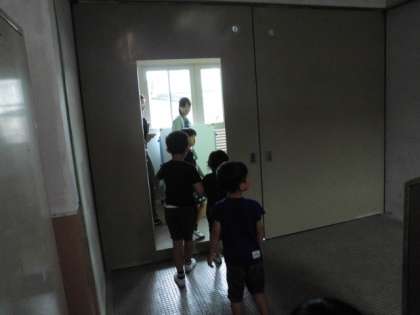 運動場から教室へ戻る時に、防火扉の中の小さな扉を開けて通る体験をしました。