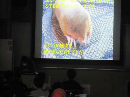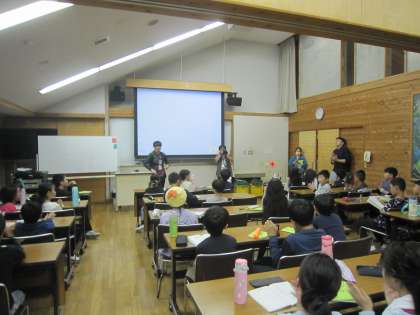 天体観測は雲の影響を受け、条件が良くなかったためできませんでした。かわりに研修室で山の家での観察できるものについてスライドで学習しました。