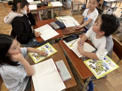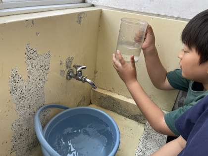 4年生の社会科では「くらしと水」をしています。くらしの中でどのくらい水を使っているのかを考えました。実際に手洗い場やトイレに行き、水を一日でどのくらい使うかを予想しました。一日で一人あたりが使う水の量が230Lと知り、驚いていました。