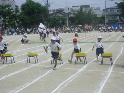 2年生の「ドラゴン太鼓」勇ましい太鼓の音に合わせて踊ります。1年生の「にん にん にんじゃ RUN太郎」忍者になった1年生。修業をしながらゴールに向かって駆け抜けます。