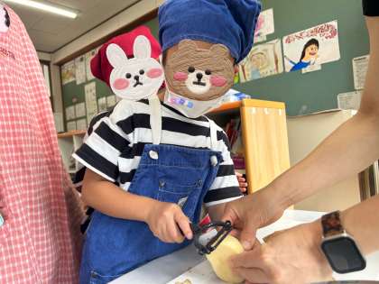 たいよう学級の畑で採れたじゃがいもを使って、ポテトサラダを作りました。じゃがいもの皮むきをしたり具材の野菜を切ったりして、みんなで協力しました。子どもたちはじゃがいもの皮むきが一番難しかったようで苦戦していました。じゃがいもを茹でる時には、ぶくぶくとお湯が沸騰する様子を見て「うわ〜!すごい!!」と言って驚いている子どももいました。一つひとつの工程が楽しくて、みんなわくわくしていました。