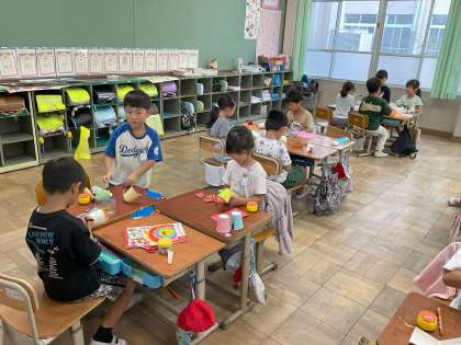 図画工作科の学習で、お家から持ってきていただいた紙コップを使って活動しました。紙コップに切込みを入れたぱくぱくする形から何に見えるかを考えました。