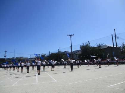 秋の澄んだ青空に6年生児童の青と白のフラッグがはためきます。