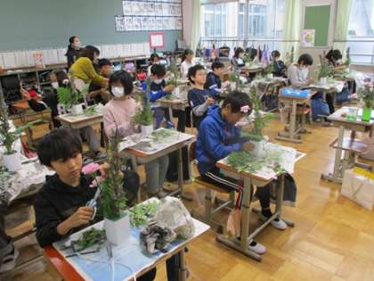 6年生は、華道の先生をお招きして華道体験を行いました。活動のはじめには、華道の歴史をわかりやすく教えていただきました。いけ花の時間になると、基本の型を教わった後は、それぞれが思い思いに、集中して取り組む姿が見られました。完成した作品には、個性や工夫があふれており、どれも素敵な仕上がりでした。