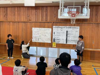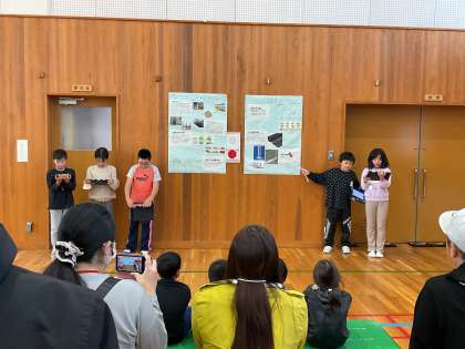家のそなえの班では、実際に家で行っている備えやこれから行ってほしい備えを紹介していました。みんなに向けて「自分の命を守るために家具の配置を考えて、家具を固定しよう。」と呼び掛けていました。