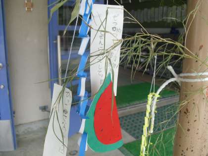 児童会の呼びかけで,「七夕のささかざり」をしています。お願い事を書いた短冊や飾りでにぎやかなささかざりになってきました。