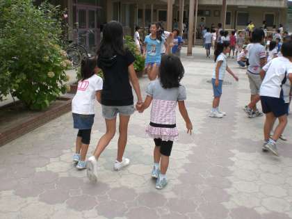 本日(9/9),中間休みに「なかよしタイム」がありました。1年生から6年生までの異年齢の縦割り集団で,6年生がリーダーとなって仲良く遊ぶ時間です。中間休みになると,下の写真のように6年生が低学年の手をつないで仲間のいる場所に連れて行く姿が微笑ましく見られます。