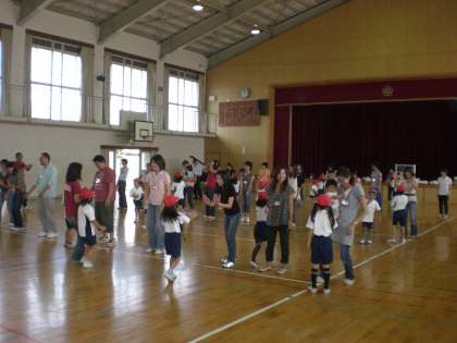 本日5校時に,1年生のふれあい活動が体育館で行われました。爽やかな気候の中,体育館では親子の競演で盛り上がっていました。