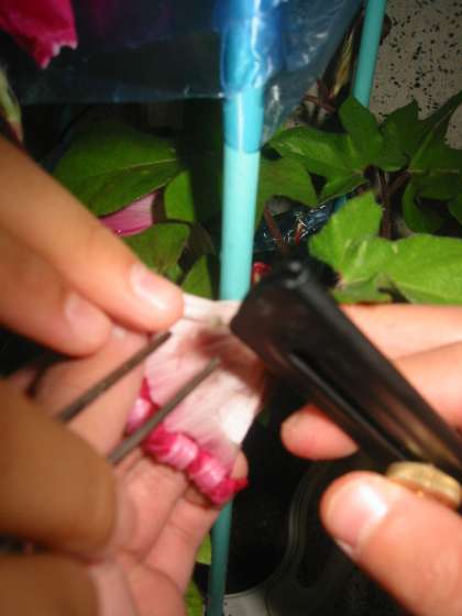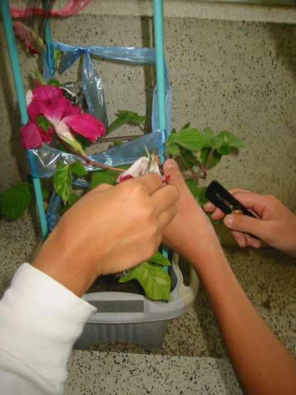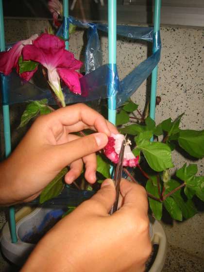 「朝顔は受粉しなければ実をつけないのだろうか」ということを確かめるために実験しています。二つの朝顔を用意し、つぼみのおしべをすべて取り去ります。花が開いたら、一つはそのままにし、もう一つには他の花の花粉をめしべにつけます。結果は1週間後に観察します。