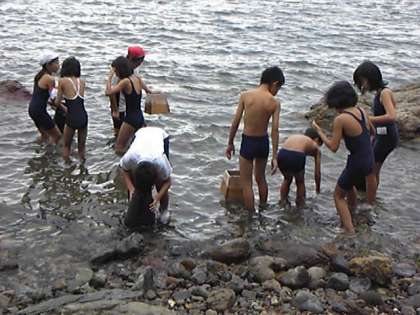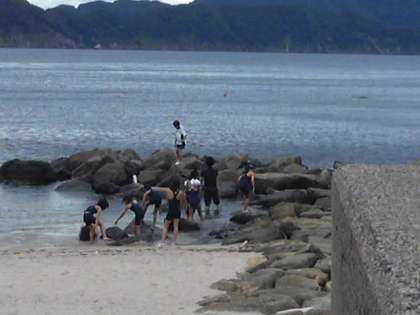 しかし,波が少しあるため,残念ながら選択活動のカヌーと大たらいは磯遊びに変更になりました。