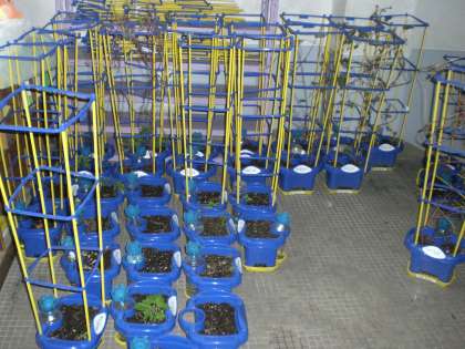 台風18号の接近に伴って,北校舎の南側に配置していた1年生のアサガオの植木鉢を校舎の中に移動しました。