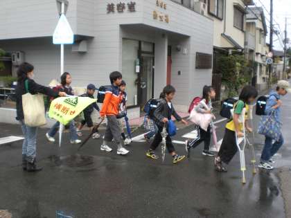 (写真上:10時に集合場所で) (写真中:集団登校で地域委員さんも協力)