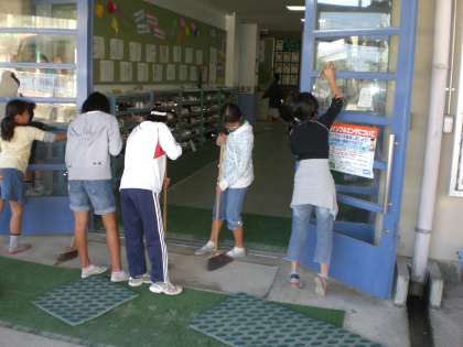 今日(10/8)の掃除で,特に玄関付近は昨夜来からの台風の影響で相当汚れていました。掃除担当は6年生です。掃除時間を告げるチャイムと同時に6年生のみんなは,手際よく掃除にかかりました。