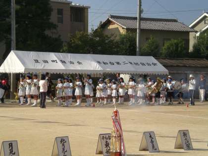 本日(10/11),秋晴れのもとに桂学区民体育祭が盛大に行われました。金管バンドの先導で各町内チームの行進が始り,開会式では前年度優勝の町内より優勝旗返還などがありました。