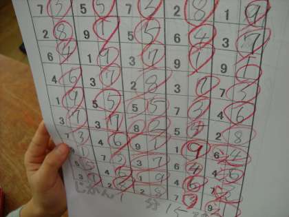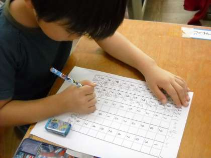 1年1組の教室をのぞくとシ〜ン。子ども達が何かに夢中になっていました。よく見るとタイムを計って50問の計算をしています。「1年生が50問のけいさん!」その事に驚いてしまいましたが,それどころか終わった子は邪魔にならないようにする事,答え合わせの時もしっかりと声を出して言えている事,50問を1分台でできている事等など1年生の成長に驚く事ばかりでした。花丸をいっぱいあげると「また来てね」と喜んでくれました。