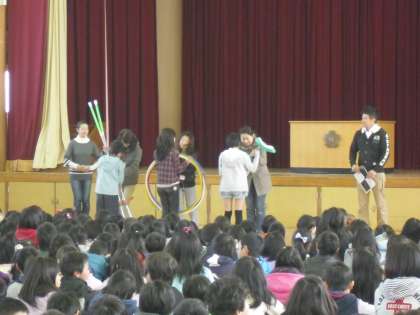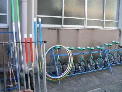 全校で長い間ためてきたベルマークの点数で,遊具を買うことができました。一輪車,竹馬,フラフープをボランティアでベルマークを集計してくださったPTAの方から贈呈していただきました。