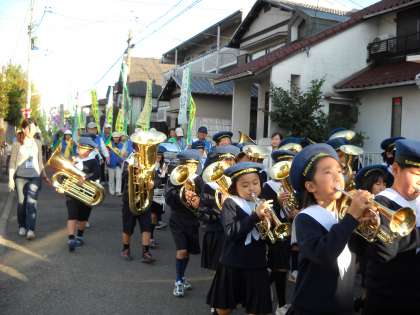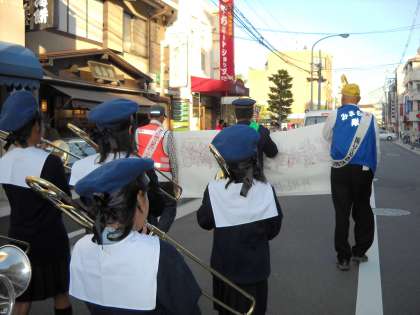 南門を出発して駅に向かいましたが,重い楽器を抱えながらも子どもたちはしっかりと演奏をし,沿道でご覧の地域のみなさんの温かい笑顔をいただきました。駅前に到着した後も,青パトの出発を演奏で送り出し,一緒にパレードされた地域のみなさんから大きな拍手をいただき大満足でした。