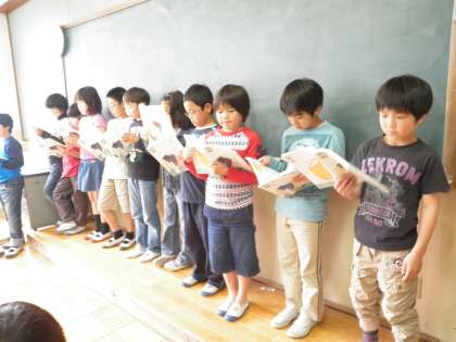 今回は、グループに分かれて3年生に聞いてもらおうということで、緊張しながら3年生の教室に行きました。3年生は、みんないっしょうけんめいきいてくれて、みんなうれしかったようです。「どうしたらすらすら音読できるようになりますか?」「4年生ははっきり読めていてすごいと思いました。」などと言ってもらい、「きんちょうしたけどがんばってよかった〜。」と満足した様子の子どもたちでした。