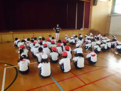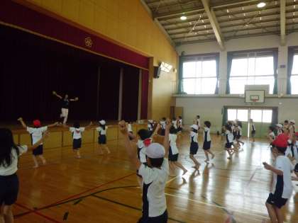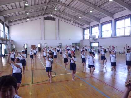 運動会の練習が始まりました。4年生は,団体演技で沖縄の民舞「ちゃーびらさい」を演技します。子どもたちは,四つ竹を使った民舞を楽しみながら,いい演技ができるようにふりつけを覚えて練習をがんばっています。