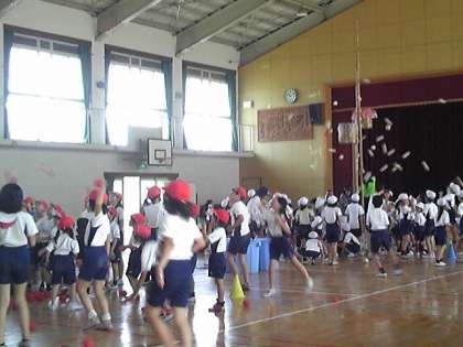 体育館では,玉入れの練習をしていました。あれ?籠が2つ!さて,どうなるのでしょう!お楽しみに。