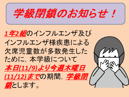 1年2組のインフルエンザ及びインフルエンザ様疾患による欠席児童が多数発生したために,本日(11/9)より11/12(木曜日)までの間,学級閉鎖とします。