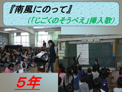 5年生の学芸会『じごくのそうべえ』で,劇の最後を飾る歌が『南風にのって』。本館2階から素敵な歌声が聞こえてきました。4階に上がってみると,5年生が見事に歌っていました。劇も楽しみですが,この歌も聞かせます。 乞うご期待を!