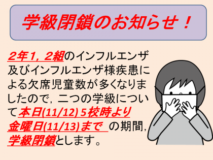 今日(11/12)の5校時から明日(11/13)まで学級閉鎖