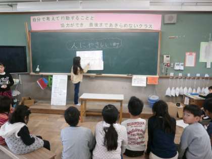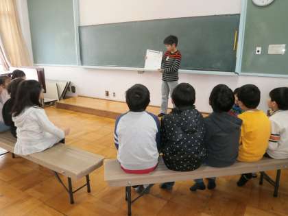 総合の学習「人にやさしい町」の学習でそれぞれのテーマで調べてきた事をまとめて,3年生に向けて発表をしました。3年生に聞いてほしい。わかってほしい。という思いで伝わるように発表を色々な工夫をしていました。3年生も一生懸命聞いてくれて良い発表会ができたと思います。また,総合の時間に講師として来ていただいた山下さんにも聞いていただく事ができました。