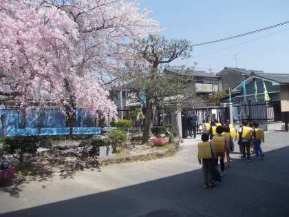 桜の吹雪の中,先生に引率してもらって集団下校しました。