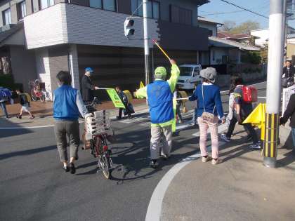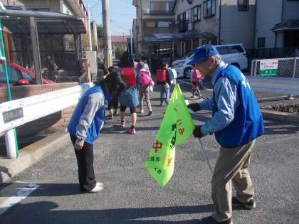 好天に恵まれて,地域の皆様に見守られて登校しています。