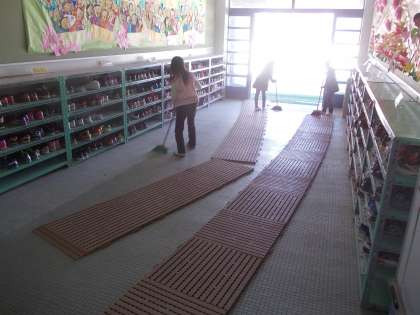 たくさんの児童・教職員・保護者の方々・地域の皆様が出入りされる玄関は,いつも清掃が行き届いています。すのこを少しずつずらして,隅々まできれいにしてくれています。