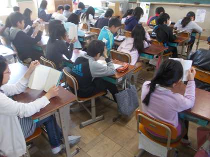 掃除から戻ってきた児童は,5時間目が始まるまでの間,ゆったりと読書をしています。