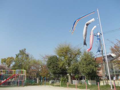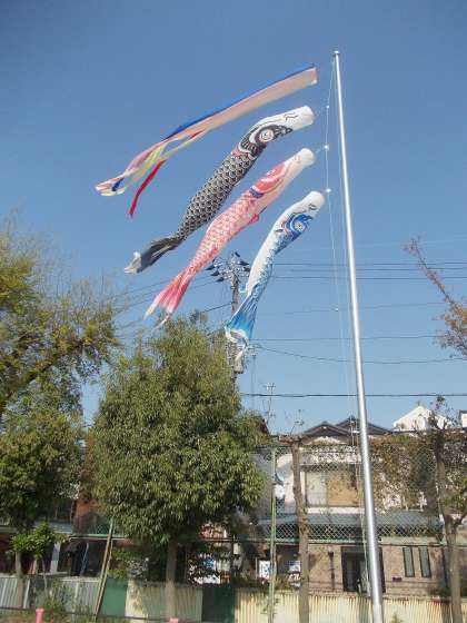 きれいな青空にこいのぼりが泳いでいます。地域の方からいただいたものです。