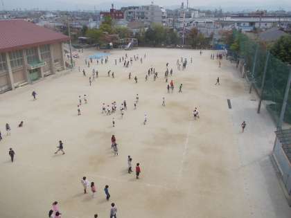 楽しそうに遊んでいます。運動場の端のこいのぼりに見守られています。