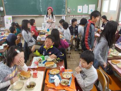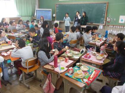 1年1組の給食のお手伝いに行っている人が帰ってきました。「いただきます」の前に,「今日誕生日の人がいるので,牛乳で乾杯して祝ってあげましょう」という提案がありました。とても和やかな雰囲気の給食でした。