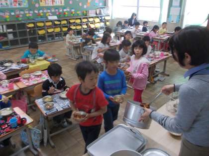 昨日までは6年1組の児童と担任の先生が給食のお手伝いに来てくださっていました。ただ手伝ってくださっただけでなく,丁寧に教えていただきました。今日はそれを活かしてがんばりました。