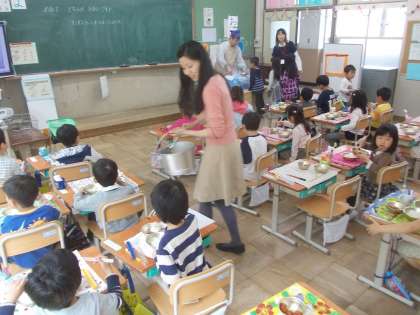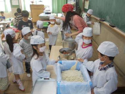 昨日までは6年2組の児童と担任の先生が給食のお手伝いに来てくださっていました。ただ手伝ってくださっただけでなく,丁寧に教えていただきました。今日はそれを活かしてがんばりました。