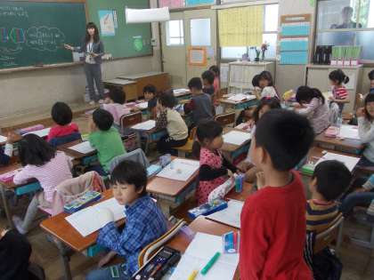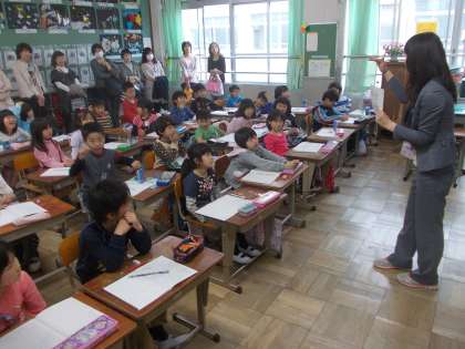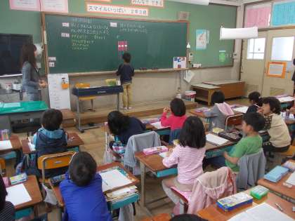 算数科の『たし算とひき算』お家の方が問題屋さんになって,2けた+1けたのくり上がりのある計算の暗算に挑戦している様子を参観していただきました。