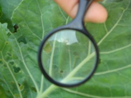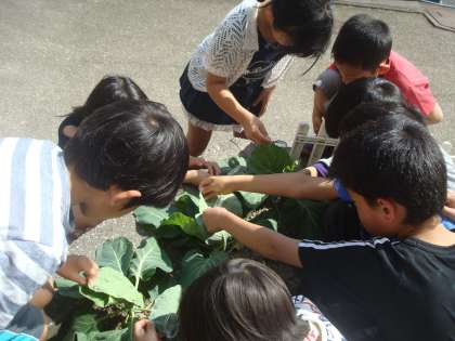 植えていたキャベツに蝶がいっぱいたまごを産んでいたので観察をしました。どれがたまごか教えると,「小さい〜!」とびっくりしていました。もう幼虫も産まれていました。