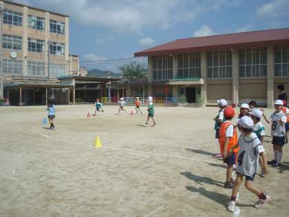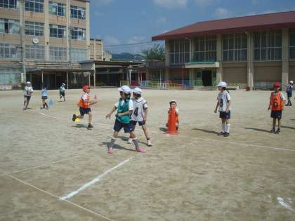 体育の「リレー」の学習ももう4時間目になりました。バトンの渡し方,勢いよく追い抜かす方法などを,友だち同士でアドバイスし合ってます。「がんばれ!」「最後まであきらめるな!」とはげましたり,「たのむで!」とバトンを渡していたり,チームワークがとてもよくなってきています。