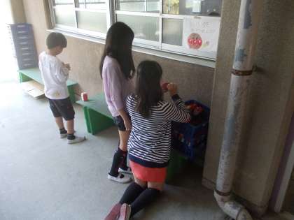 また,返却時には6年生の給食委員さんが,膝立ちをして低学年の児童の背の高さに合わせて牛乳パックの整理をしてくれました。洗って返却された牛乳パックは,業者に回収してもらってリサイクルされ,トイレットペーパーに生まれ変わります。