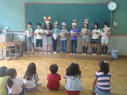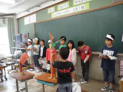 今日は国語で練習していた「きつつきの商売」の音読を2年生に発表しました。今日の本番まで,お面や小道具も工夫して一生懸命練習してきました。
