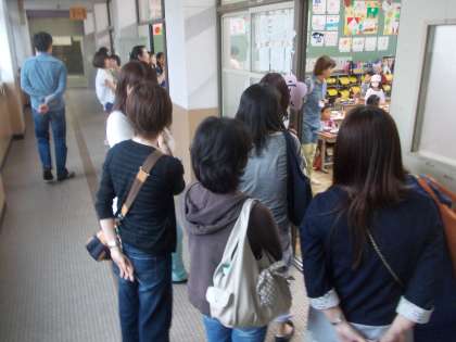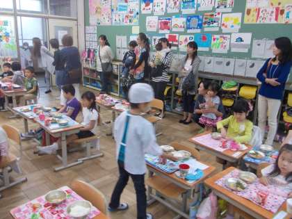 1年生の児童が給食を配膳する様子を参観していただきました。1年生は入学から1カ月,すっかり小学生らしくなりました。