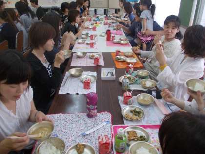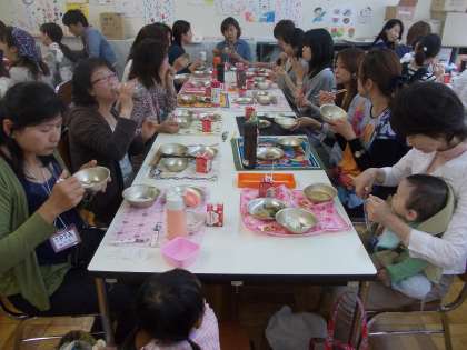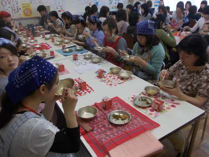 実際に子ども達が食べている給食を食べていただきました。PTAの役員の皆様,ありがとうございました。