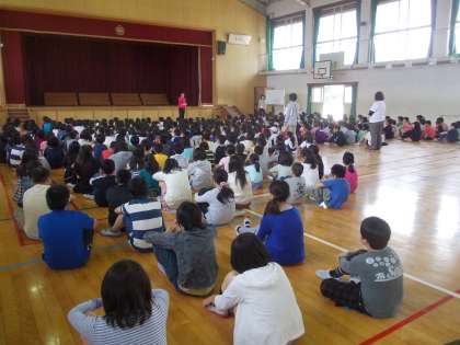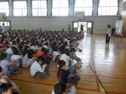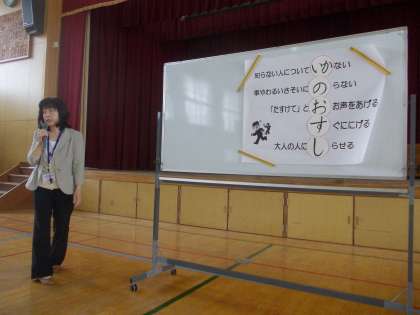 不審者が退出したという想定で,体育館に集合してお話を聞きました。校長先生から『いか・の・(お)・す・し』の話を聞きました。