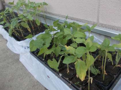 金曜日の夕方にたっぷり水をあげたのですが…土日の好天で,すっかり苗が弱っていたので『腰水』処置をとりました。午後にはすっかり元気になったので,腰水を外しました。腰水を張ったままでは,根から空気が吸えないので『根腐り』をおこす恐れがあるからです。