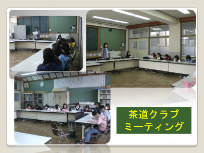 2/2(火)茶道クラブのミーティングが中間休みにありました。2月の終わりに6年生に贈られる奨励賞授与の会の説明など,2・3月の予定表が渡されました。今年度のお稽古も残りわずかです。
